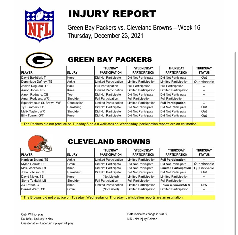 Bears injury report spread overunder schedule live stream TV channel by Freddie Boston 1 week ago Follow FreddieBoston Tweet. Packers Clevelands Pro Bowl pass rusher did not practice this week after suffering the injury Monday vs. Heres a full breakdown of the Packers final injury report ahead.